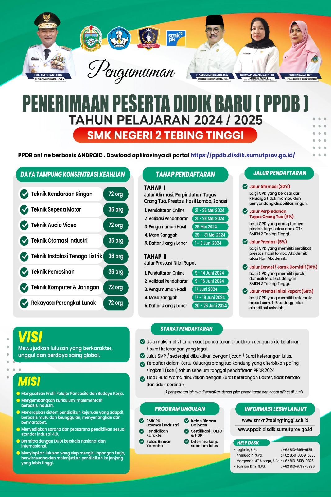 SMK Negeri 2 Tebing Tinggi membuka pendaftaran Peserta Didik Baru Tahun Pelajaran 2024/2025. Selengkapnya baca disini: